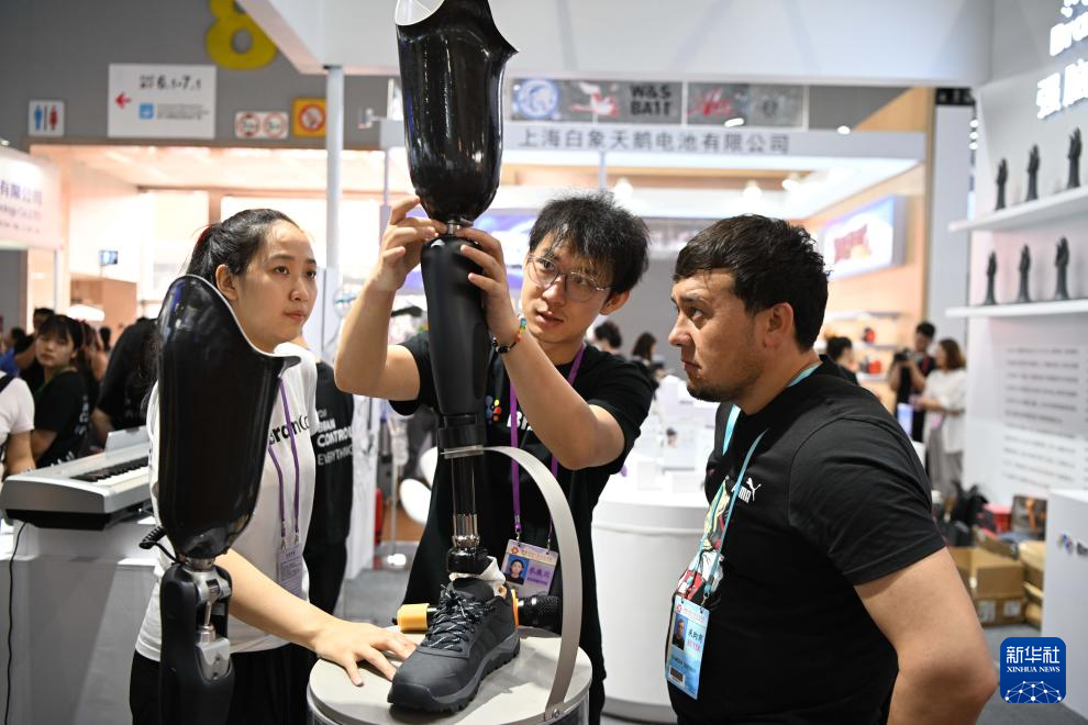 4月17日,外國采購商在強腦科技展臺觀看智能仿生腳。新華社記者 鄧華 攝