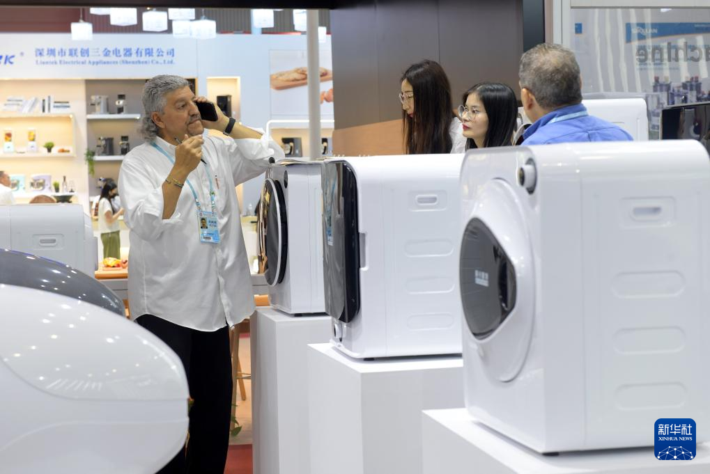 4月15日,孟加拉國采購商在廣交會智慧生活展區了解智能家電產品。新華社記者 劉大偉 攝
