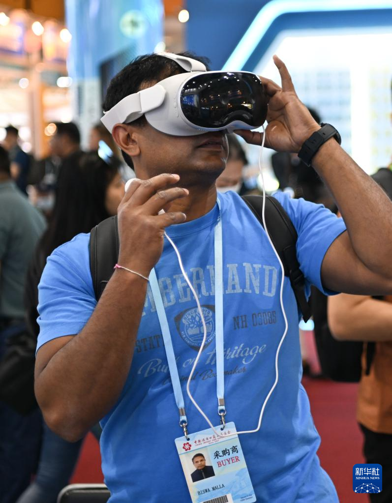 4月17日,境外采購商在體驗虛擬現實眼鏡。新華社記者 鄧華 攝