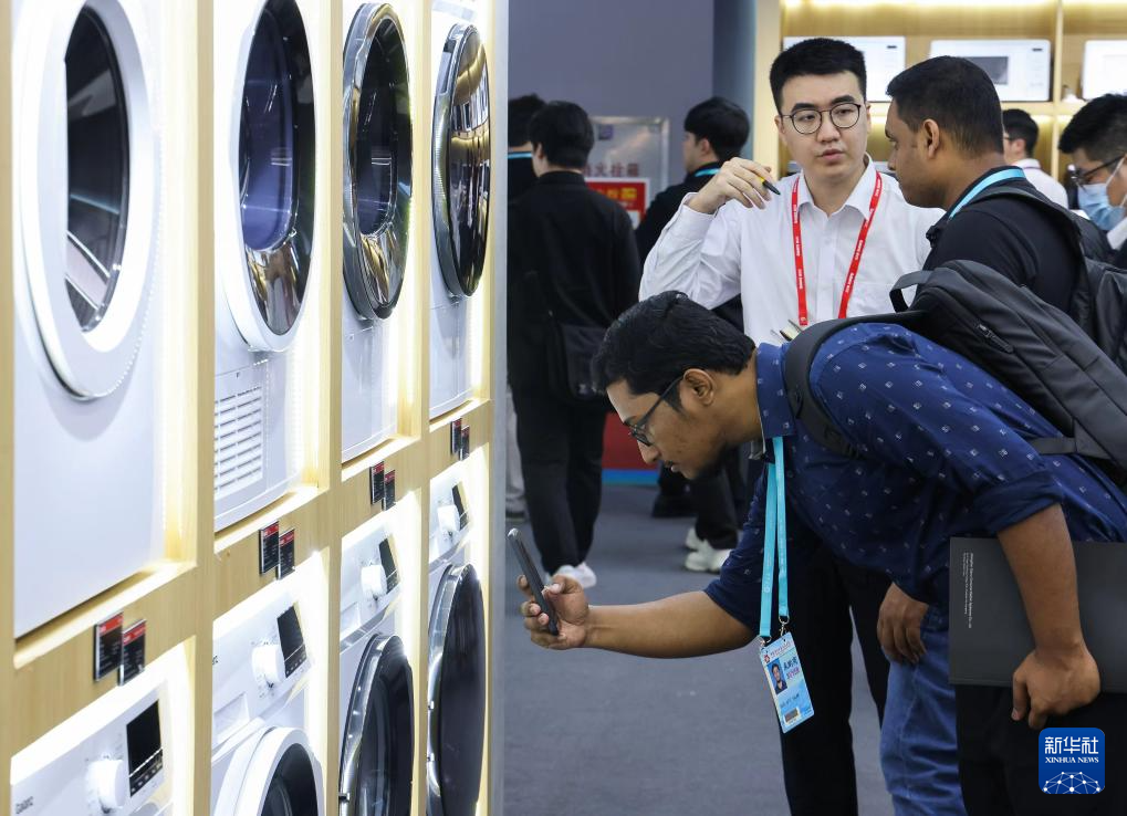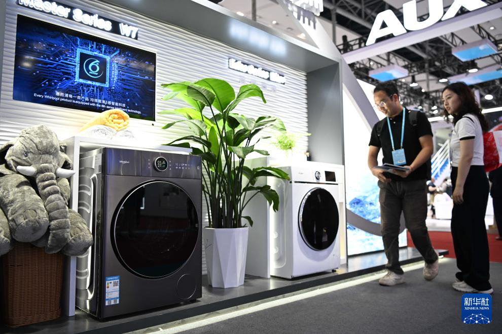4月17日,參觀者在惠而浦智能家電展區了解洗衣機產品。新華社記者 鄧華 攝