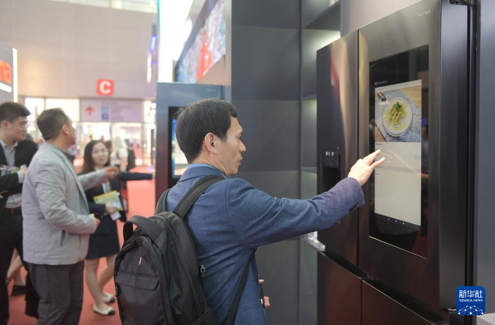 4月16日,客商在體驗海信智能大屏冰箱。新華社記者 盧漢欣 攝