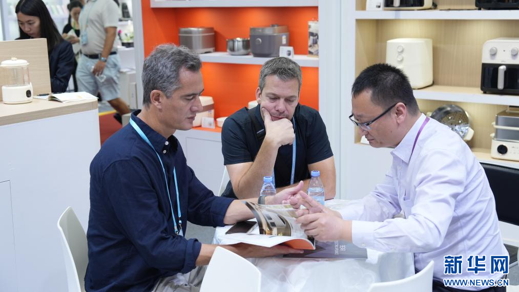 第135屆廣交會上,境外采購商在一家小家電展臺洽談業務。新華網發(吳昊天攝)