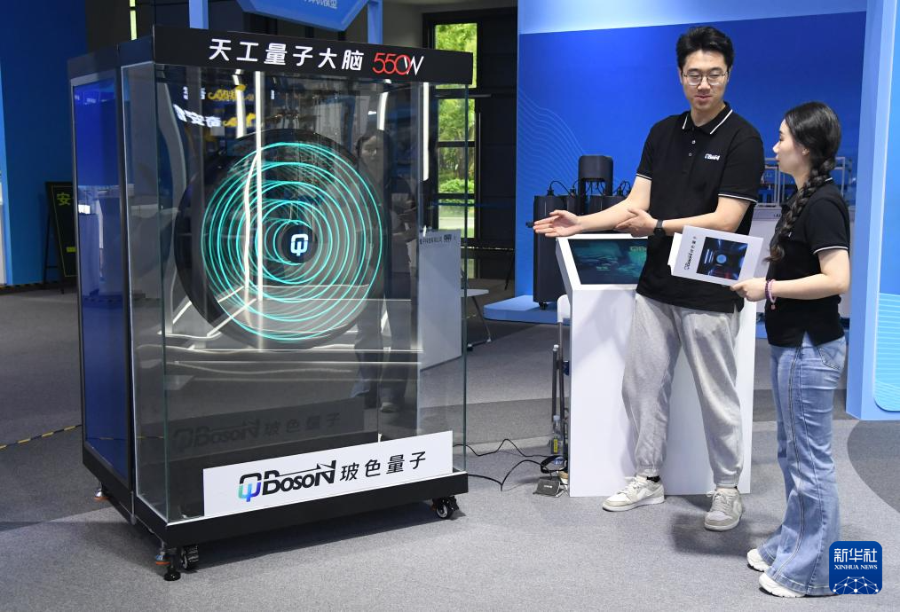 2024年4月28日在中關村展示中心常設展中拍攝的550量子比特相干光量子計算機,該產品聚焦“相干量子計算”路線,采用相干光脈沖相位編碼量子比特,并通過控制器對脈沖進行相互注入,實現對復雜組合優化問題的快速計算,以及人工智能計算加速。新華社記者 任超 攝