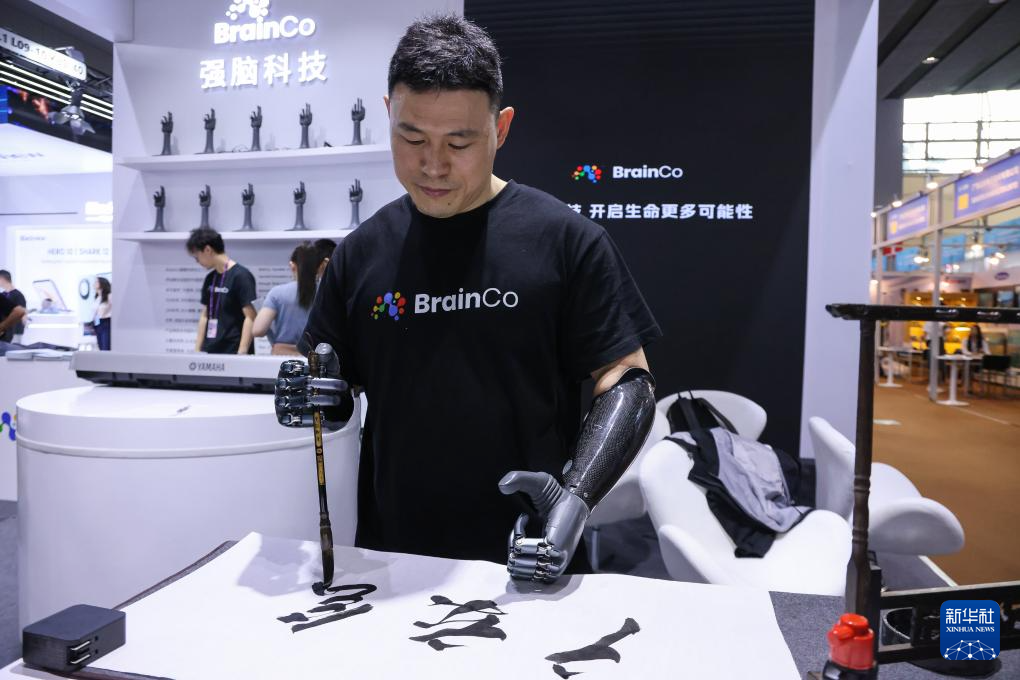 強腦科技員工倪敏成在第135屆廣交會上展示智能仿生手(2024年4月15日攝)。失去雙前肢的倪敏成佩戴智能仿生手后,生活能夠自理,還能寫書法。新華社記者 劉大偉 攝