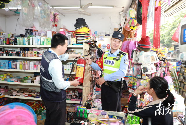 3月28日,常教社區民警和網格員在常教社區檢查九小場所消防相關設施。順德區委政法委供圖