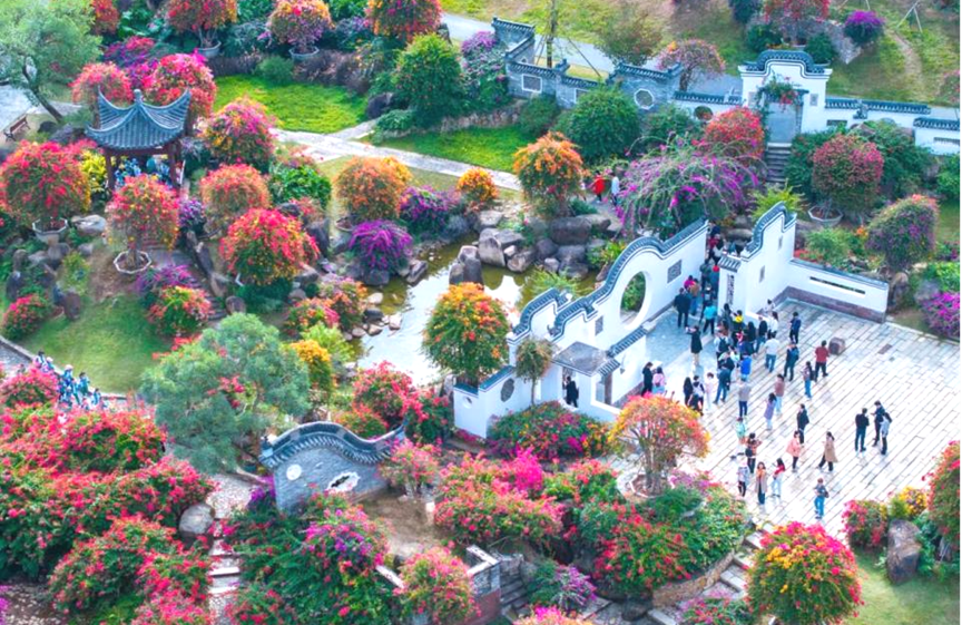 青磚灰瓦、亭臺樓閣,嶺南傳統建筑與奇石、三角梅巧妙結合,天溪亭、親水棧道、仿古景墻等移步易景,形成“園在花中,花在園里”的意境,展現古色古香的嶺南韻味。
