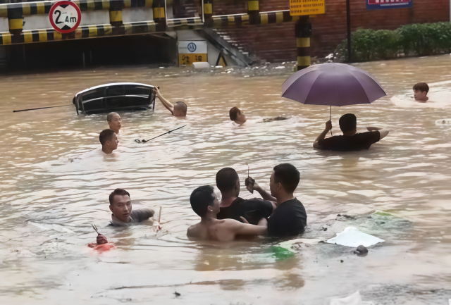 兩天前,東莞市塘廈鎮出現暴雨強降雨天氣,深圳司機李某因受雨勢影響且不熟悉路況,不慎駕車沖入大嶺古橋涵積水潭。由于下沖慣性大,車輛沒過多久就漂到積水潭中央,快被水沒過車頂。危急時刻,7名群眾相繼下水,與塘廈派出所民警趙慶輝、溫東林一道,通過拖拽車輛、借力限高架推車、拉開車門、使用工具敲打車窗、扣扒車尾箱鎖鈕等救援辦法,成功將司機從車尾救出。整個救援過程僅用時3分鐘。