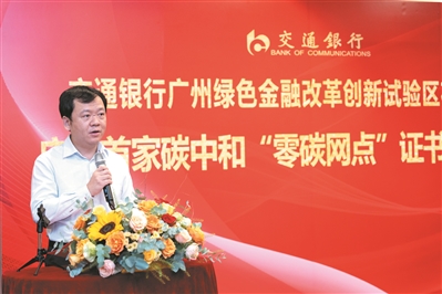 為貫徹《關于完整準確全面貫徹新發展理念做好碳達峰碳中和工作意見》,服務“碳達峰、碳中和”目標,推動綠色低碳發展,在人民銀行廣州分行和廣東金融學會綠色金融專業委員會指導下,交通銀行廣東省分行全面推進綠色金融業務發展。2020年至2021年,廣州綠色金融改革創新試驗區花都分行完成187噸國家核證自愿減排量(CCER)注銷,實現連續兩年全年因辦公活動產生的溫室氣體排放的碳中和目標,獲得“碳中和”雙榮譽,標志著廣州地區銀行業首家、交行系統內首家“零碳網點”正式落地。2021年11月5日,碳中和證書頒發儀式在花都分行舉行,廣州市花都區政府、廣州市花都區金融局等領導,交通銀行廣東省分行黨委委員、副行長黃海出席本次活動。