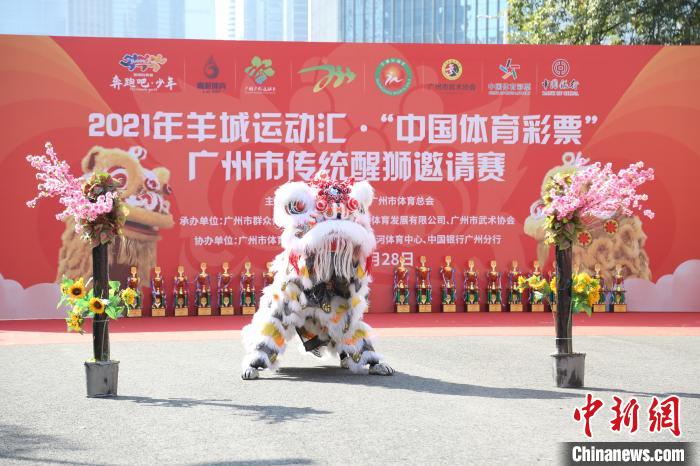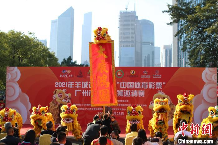 28日的廣州市天河體育館東廣場鑼鼓喧天、征旗林立,60多頭醒獅、300多名醒獅隊員身穿色彩繽紛的龍獅圖騰服裝在此“比武”,同場競技。當日,由廣州市體育局、廣州市體育總會主辦的2021年羊城運動匯·“中國體育彩票”廣州市傳統醒獅邀請賽在此舉行。