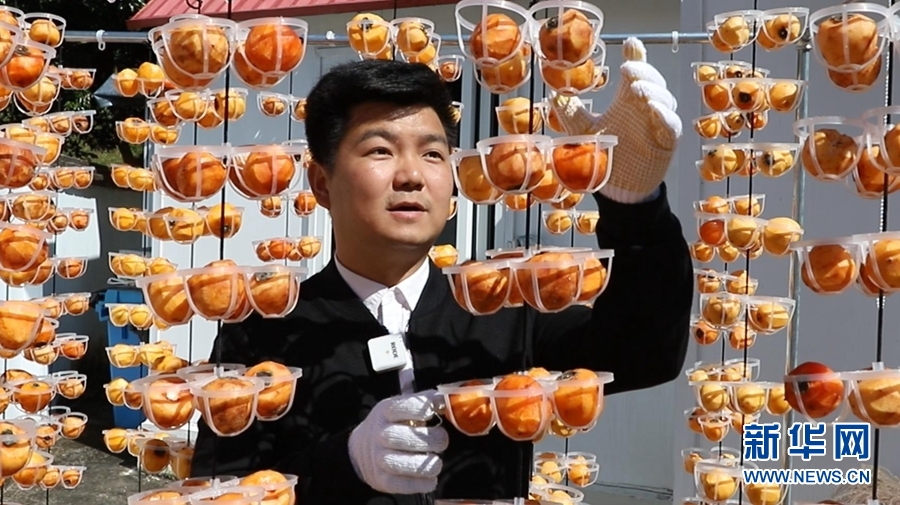 廣州市從化區江埔街上羅村創業青年邱國健創新曬柿干方式。新華網發(羅素玲攝)