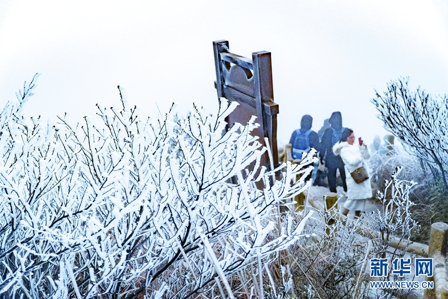 人們在霧凇之間拍照留念。新華網發(曾令華攝)
