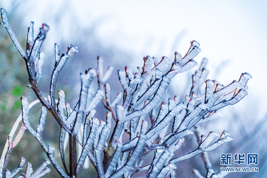 金子山的樹葉、青草漸漸披上了“冰外衣”。新華網發(曾令華 攝)