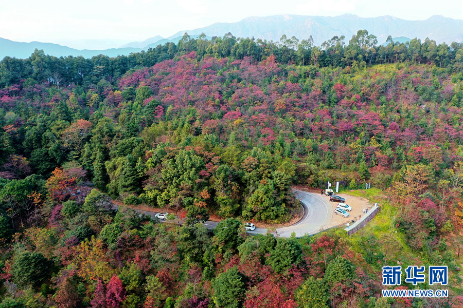 紅葉與周邊縱橫交錯的路網共同構成了翠綠、橘紅、深紫的漸變美景。新華網發(陳冠游 攝)