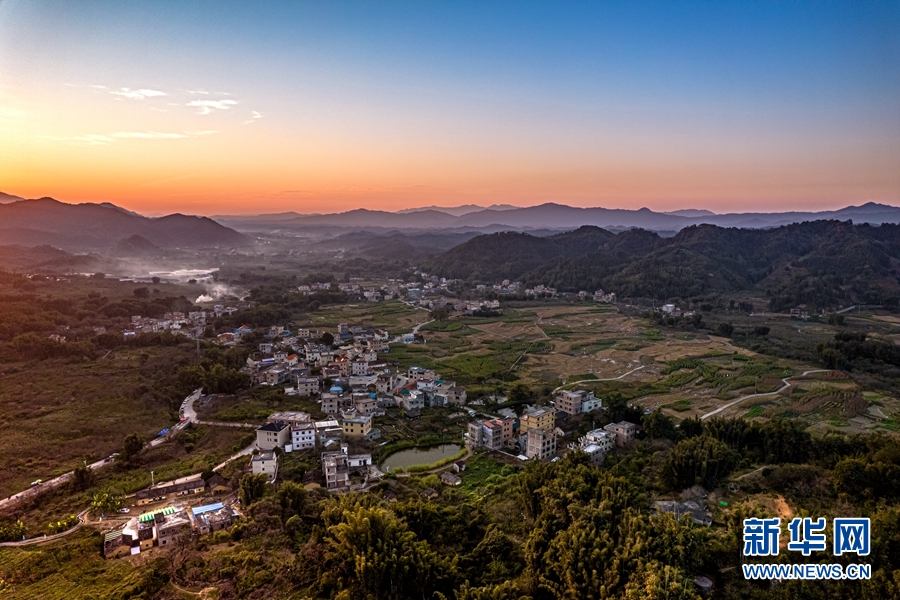 在朝霞的掩映下,炊煙裊裊喚醒沉睡的村莊。新華網發(黃敏生攝)