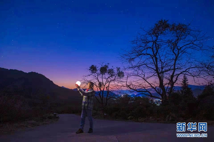 夜幕下,站在山的高處,賞月者張開雙手,假裝捧起了月亮,十分逗趣。新華網發(鄧廣斐 攝)
