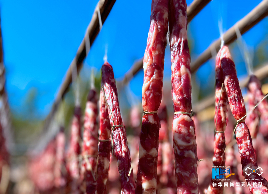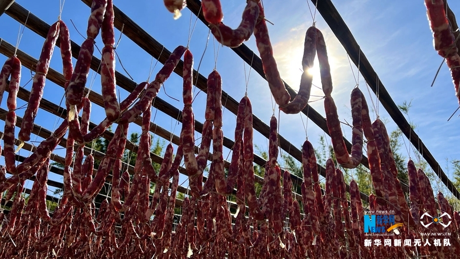 一排排臘肉整齊地鋪排在竹竿上,晾曬場臘香四溢。新華網發(羅素玲 攝)