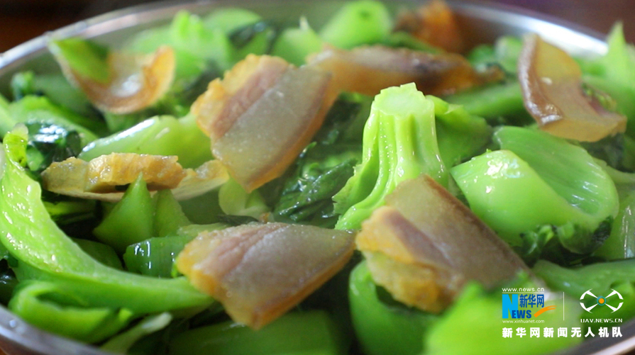 臘肉肉質光亮有澤,呂田大芥菜炒臘味是過年招待客人的首選菜品之一。新華網發(羅素玲 攝)