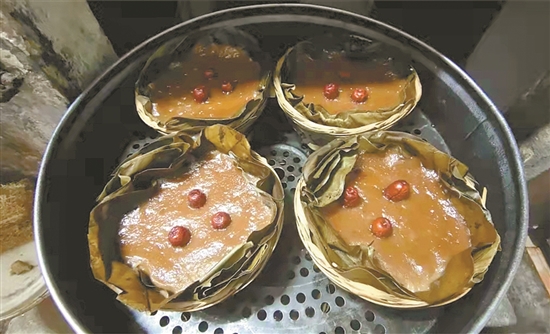 此外,還需在倒粉漿前鋪上芭蕉葉和柊葉,增添香味的同時,也可以防止粉團倒進“魚籠簝”發生漏泄。最后,就可以把“魚籠簝”放進蒸籠里蒸了。珍姨坦言,“這里最耗時了,需要依據魚龍的薄厚程度,蒸上6-8個小時。在熟前還需加上一顆紅棗在表面,寓意早(棗)生貴子?!?/p>