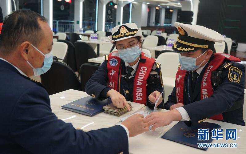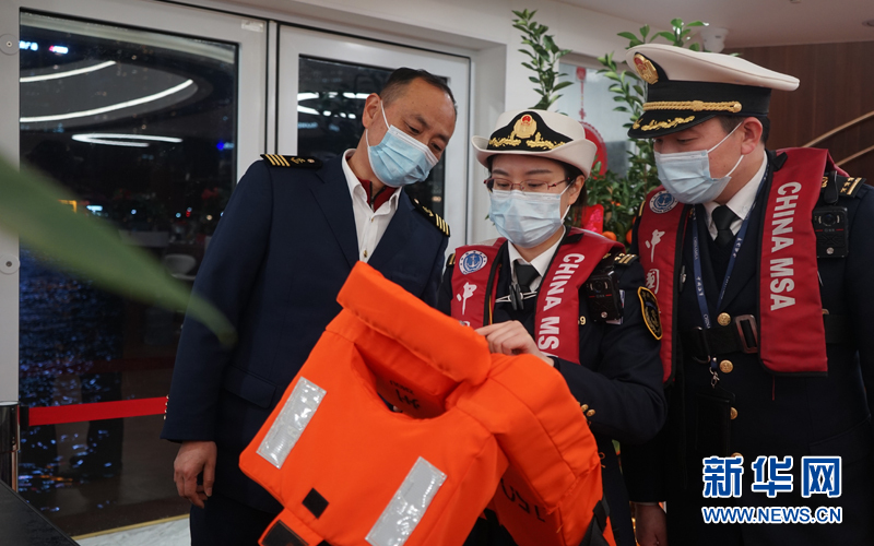 圖為鐘蓉與同事對客運船舶進行安全檢查。新華網發