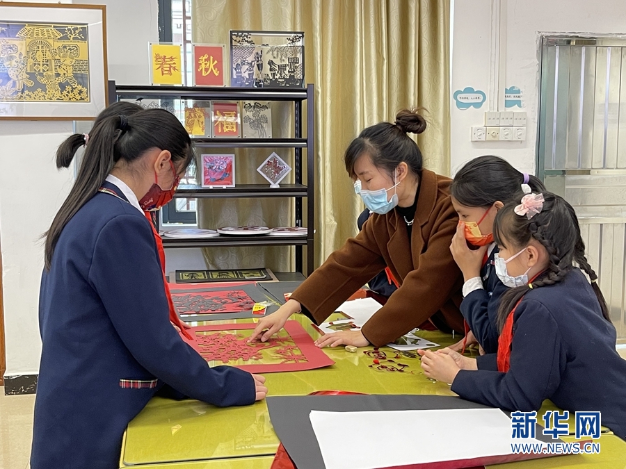 廣州市從化區溫泉鎮第一中心小學的師生們在刻紙中融入了冬奧文化元素。新華網發(鄧靜西 攝)