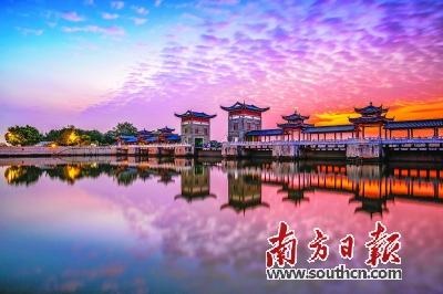 清晨,廣州市黃埔區長洲島新擔涌水閘上空祥云朵朵,霞光染紅了天際,廊橋式的水閘與水面倒影呈現鏡像之美。