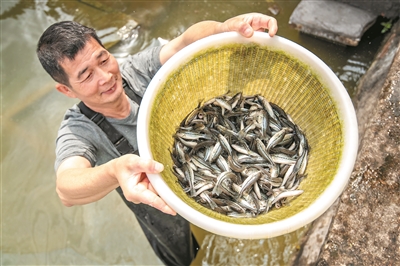 花都區花山鎮一甲魚養殖場,農人將鯪魚苗投放到甲魚塘。