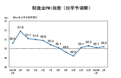 節后制造業市場需求釋放有所加快,新訂單指數為50.7%,比上月上升1.4個百分點;建筑業景氣水平明顯提升,土木工程建筑業商務活動指數為58.6%,高于上月8.9個百分點……同時,記者從國家統計局官網日前發布的2022年2月中國采購經理指數獲悉,2月份,制造業采購經理指數、非制造業商務活動指數和綜合PMI產出指數分別為50.2%、51.6%和51.2%,持續位于擴張區間,高于上月0.1、0.5和0.2個百分點。