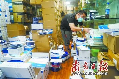 深圳華強電子世界,商家正在忙碌打包裝箱發貨。本欄攝影:南方日報記者 朱洪波