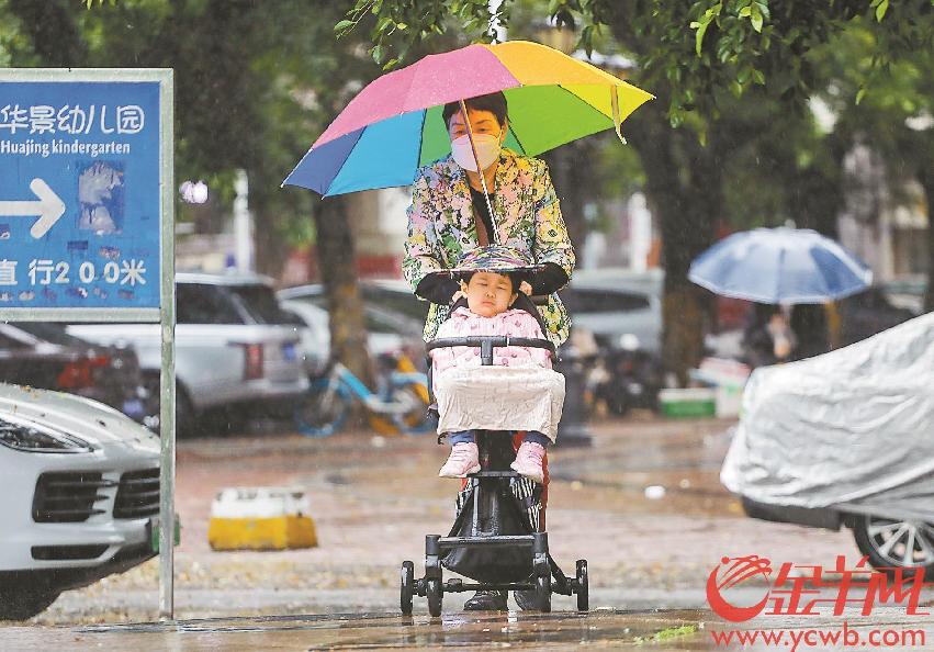 3月23日,廣州街頭,大人小孩都做足防雨保暖措施 羊城晚報全媒體記者 梁懌韜 攝