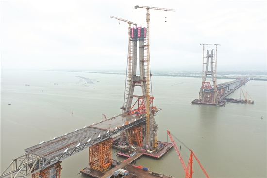由中鐵大橋局承建的汕頭市牛田洋特大橋跨越榕江南北兩岸,跨江段采用公路與軌道共建的雙層設計,主橋設計為公軌共建雙塔雙索面雙層鋼桁梁斜拉橋,主橋全長955米,主跨跨徑468米。該特大橋設南北兩座主塔,主塔設計采用極具潮汕地方特色的厝角頭加翔鷺造型,整個主塔造型優美,但在施工過程中難度極大。