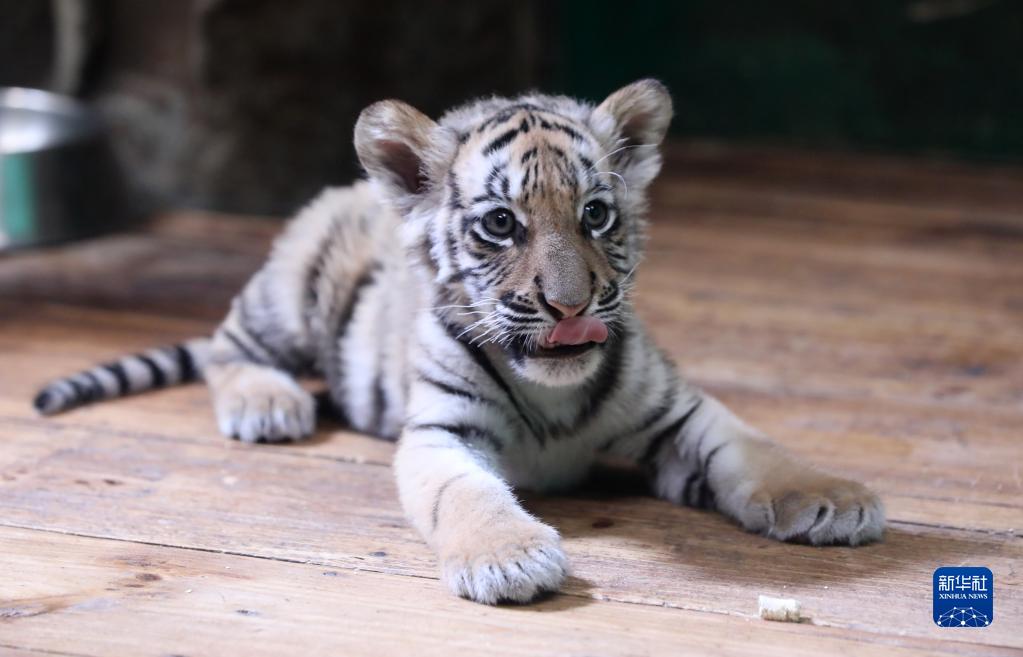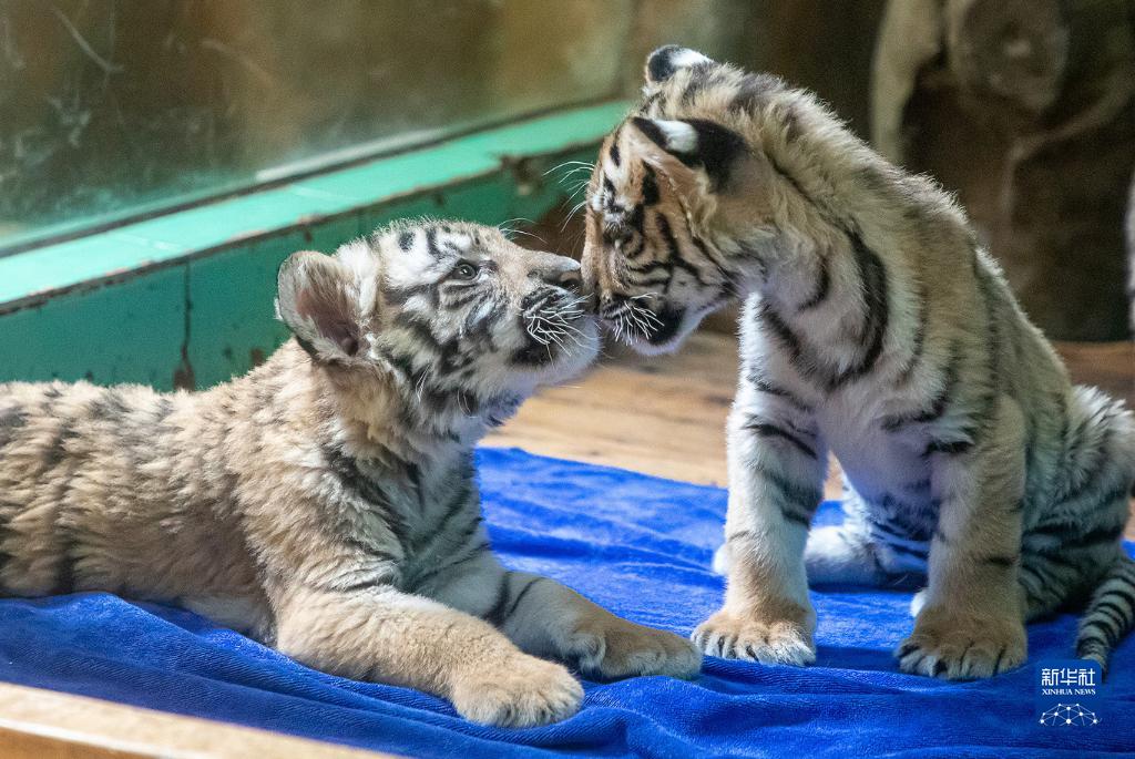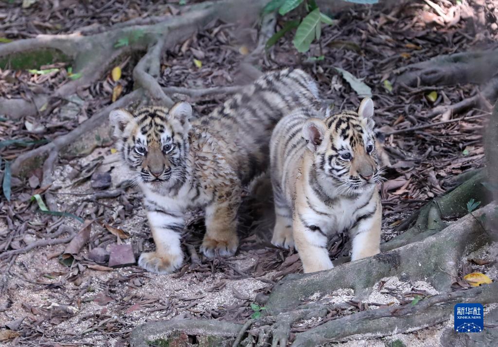4月7日,兩只孟加拉虎寶寶在一起玩耍。新華社記者 黃國保 攝
