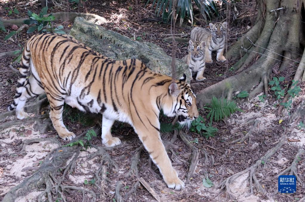 4月7日,孟加拉虎“薇薇”與她的寶寶在一起。新華社記者 黃國保 攝