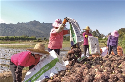 韶關市乳源縣游溪鎮江背村村委呈現出一派豐收的景象:數十名村民正在將一包包香芋從田間挑到地頭,堆積在一起,工人們圍在香芋堆周圍,為香芋清理淤泥、削剪、打包、登記、裝車,不一會工夫,10多米長的大貨車被裝得嚴嚴實實。