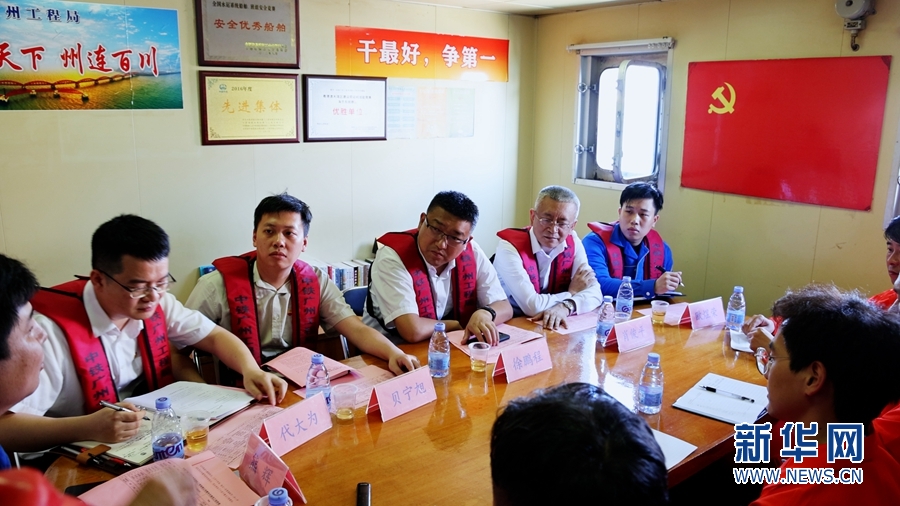 近日,中鐵廣州工程局集團團委在廣東惠來原油碼頭的一艘施工船舶上開展“海上流動圖書室捐贈計劃”暨“青年創新工作室”揭牌儀式活動。新華網發(郝留建 攝)