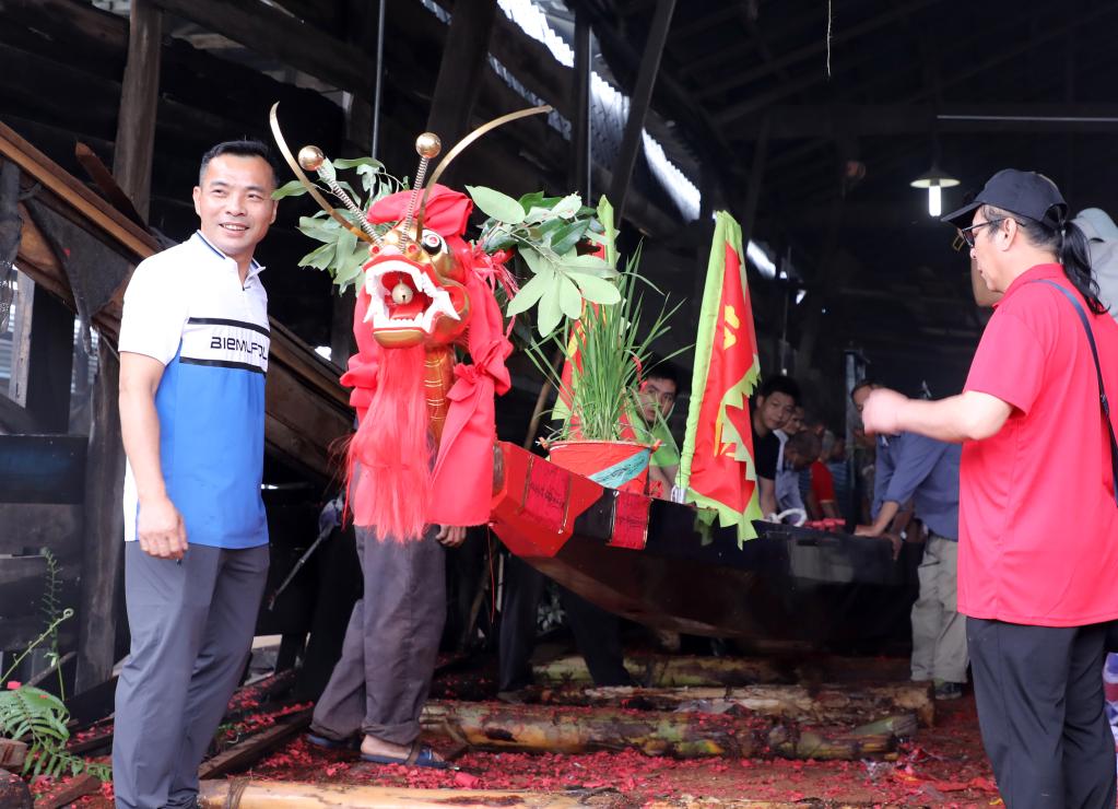 新的船身以進口的坤甸木打造,長度39.2米,比老龍船長10厘米左右?!鞍凑沾謇锪曀?,每造一條新龍船都要長一點,寓意長長久久、生生不息?!秉S劍挺說,新“東坡號”厚度相比之前增加了一倍,這也是他經手過最重的龍船。