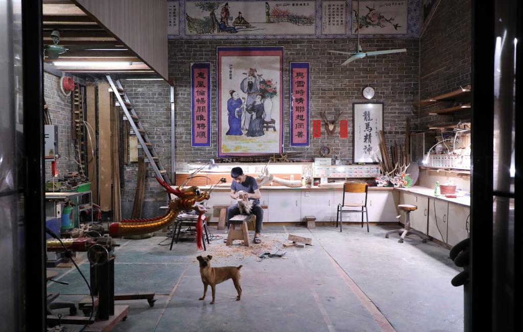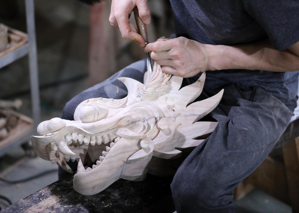 張偉潮在工作室雕刻龍頭。新華社記者黃國保 攝