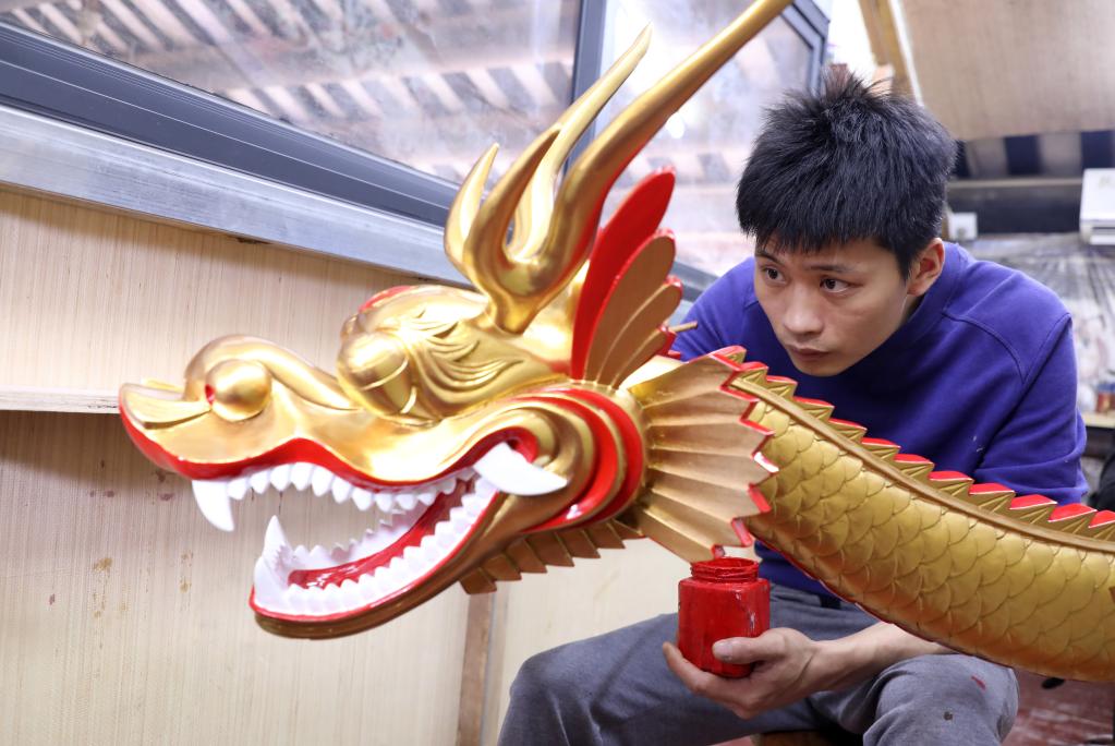 張偉潮為龍頭上漆。新華社記者黃國保 攝
