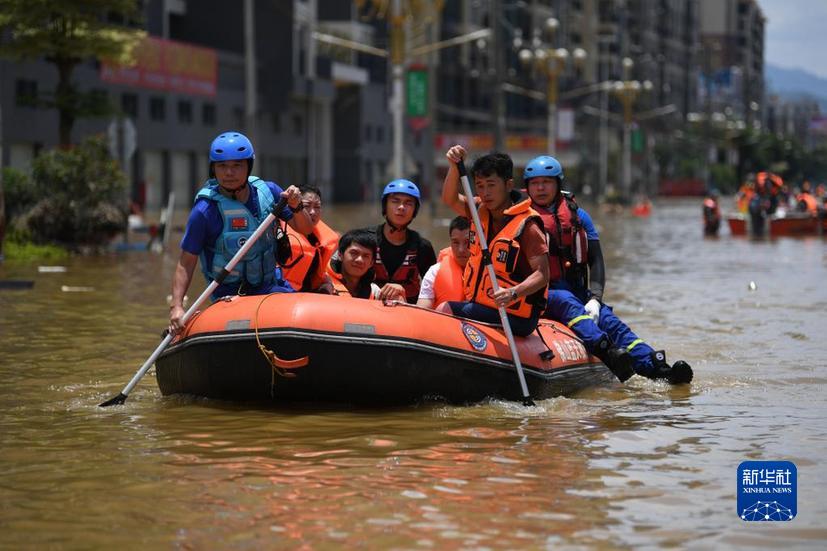6月23日,在廣東清遠英德市浛洸鎮,救援人員用橡皮艇轉移群眾。新華社記者 鄧華 攝