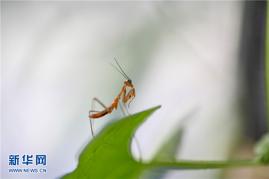 螳螂寶寶歪著腦袋四處張望(6月26日攝)。