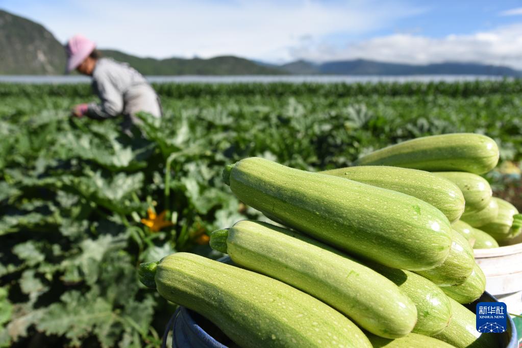 7月5日,在云南省麗江市玉龍納西族自治縣黃山街道白華社區的農田里,農民在采摘西葫蘆。新華社發(趙慶祖攝)