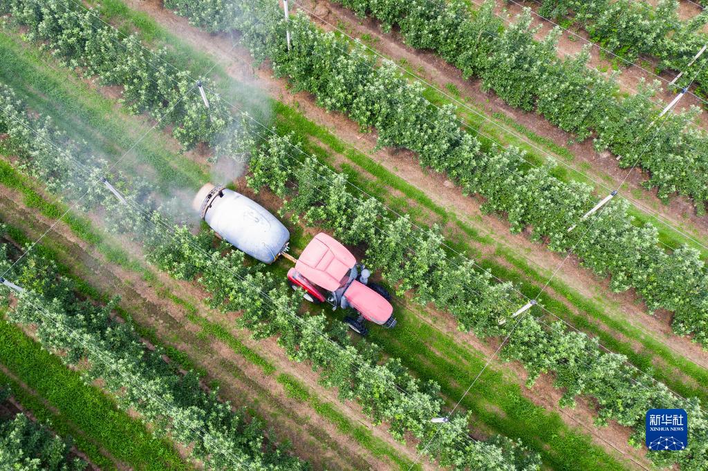 7月5日,在山東省東營市廣饒縣一蘋果種植基地內,工人為果樹進行植保噴灑作業。新華社發(劉云杰攝)