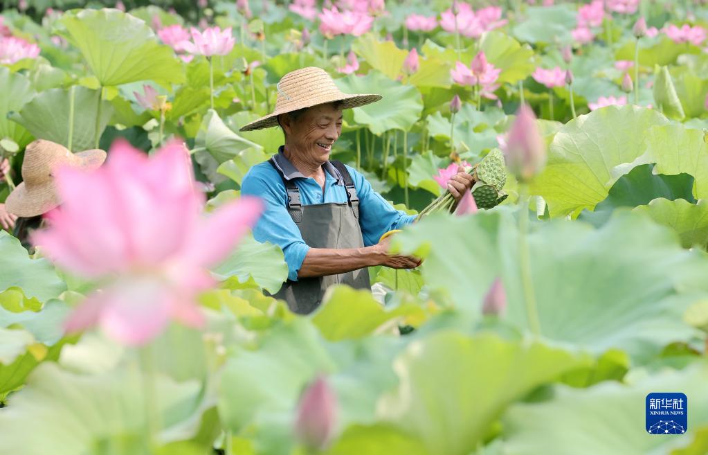 7月5日,在浙江省湖州市德清縣康乾街道聯合村,蓮農在荷塘采摘蓮蓬。新華社發(謝尚國攝)