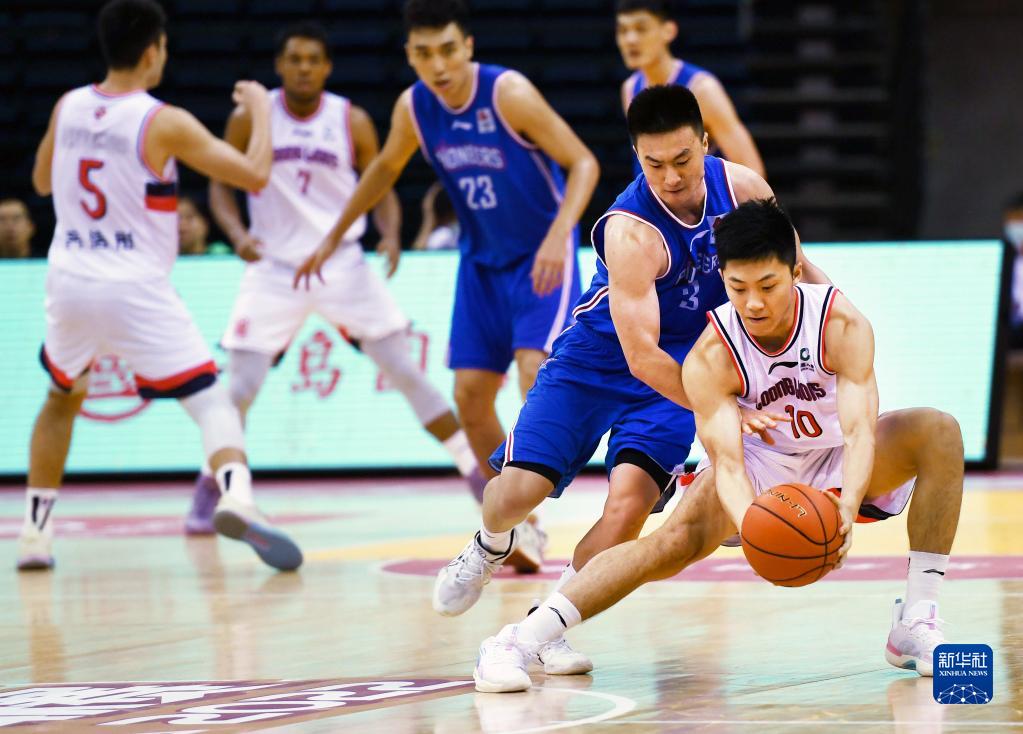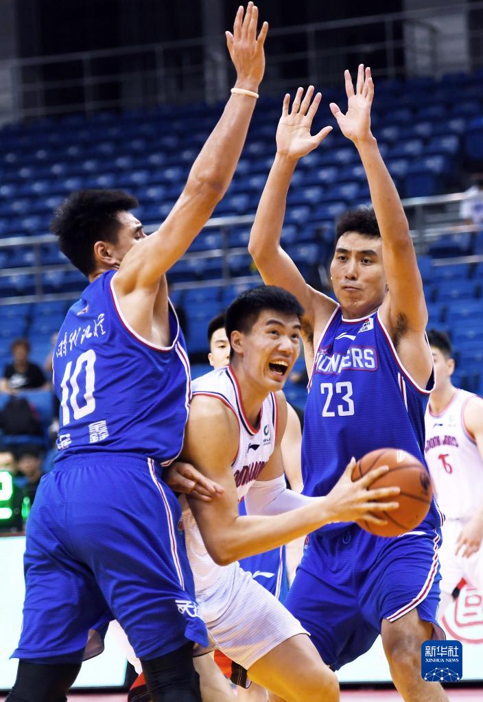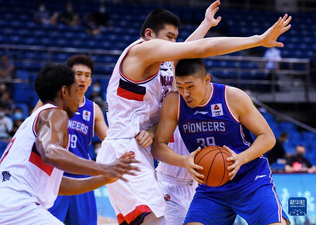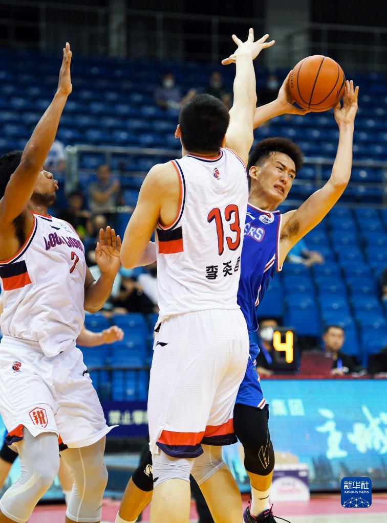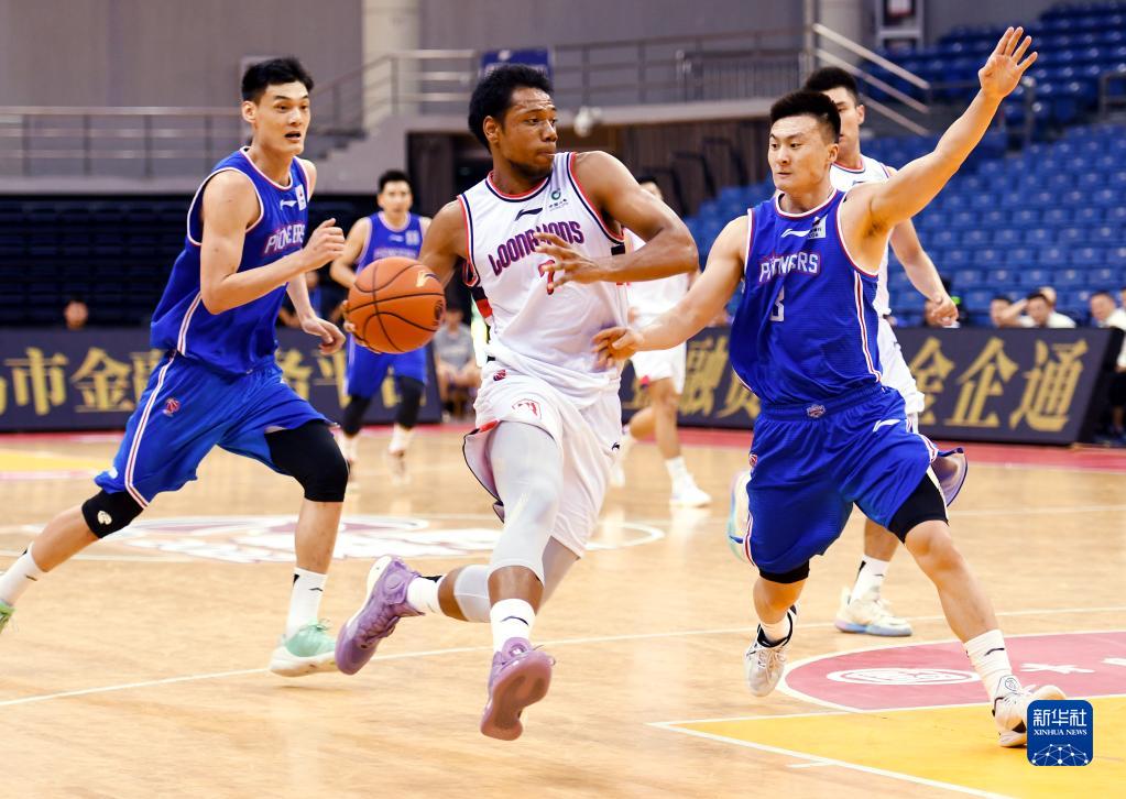 7月15日,天津先行者隊球員時德帥(右)在比賽中防守時代中國廣州隊球員焦泊喬上籃。新華社記者 李紫恒 攝