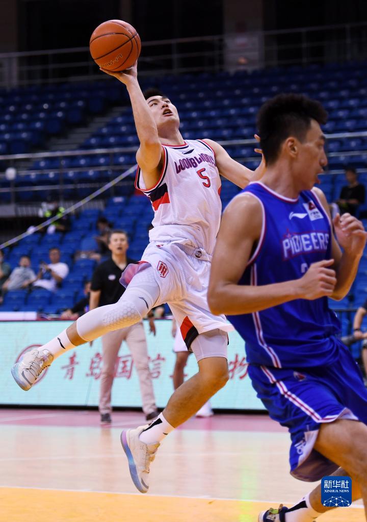 7月15日,時代中國廣州隊球員祝銘震(左)在天津先行者隊球員時德帥防守下上籃。當日,在山東青島進行的2022年CBA夏季聯賽首場比賽中,時代中國廣州隊以99比87戰勝天津先行者隊。新華社記者 李紫恒 攝