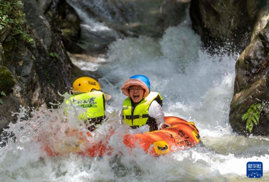7月16日,游客在貴州省黔西市中建鄉體驗漂流。