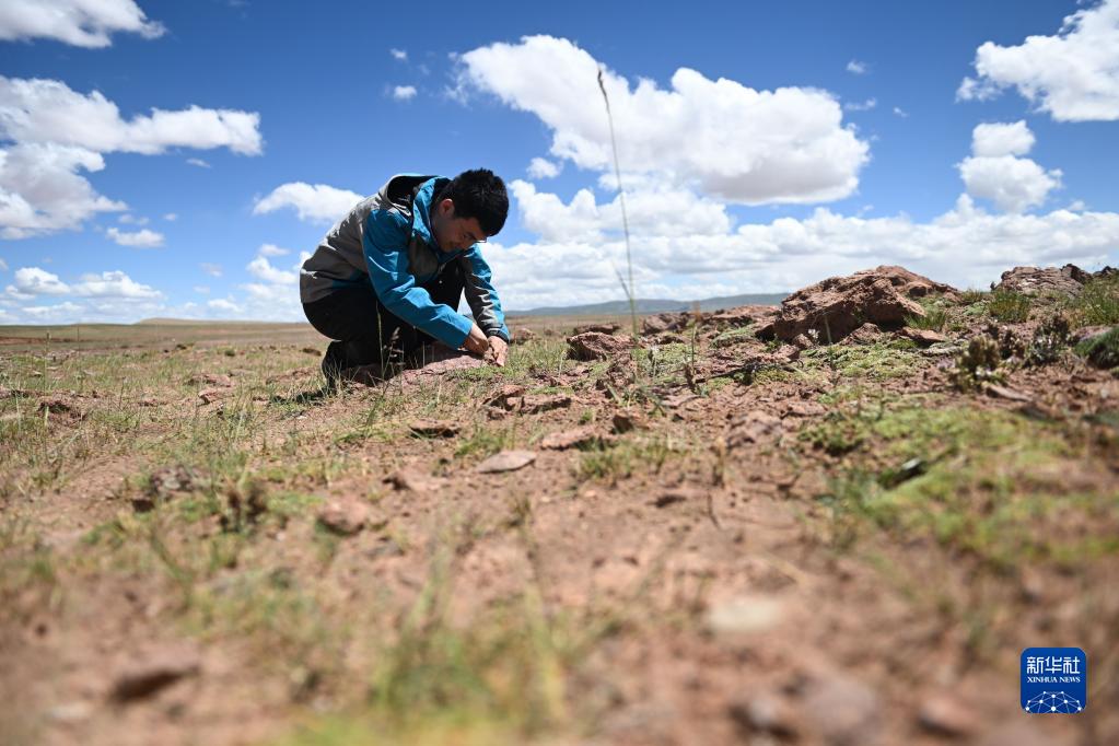 7月18日,在可可西里的“紅山脈”附近,科考隊員在采集巖石標本。新華社記者 張龍 攝