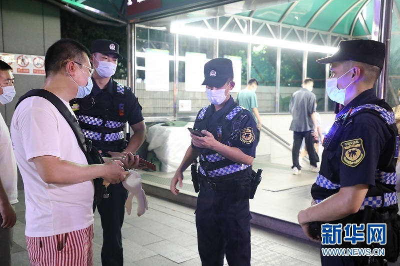 特警隊員在地鐵站口排查。新華網發(吳昊天攝)