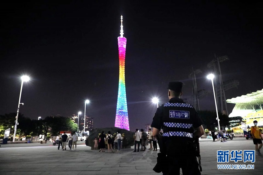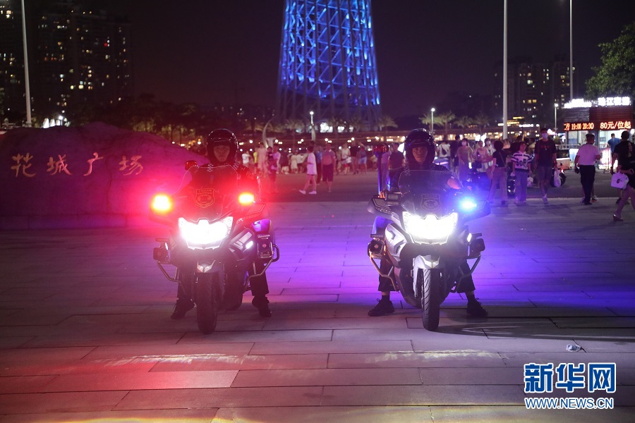 新華網廣州7月24日電(關錦恒)夜色漸濃,華燈初上,廣州的夜生活多姿多彩,夏夜的滾滾熱浪也阻擋不了市民出行的步伐。整齊的著裝、挺拔的身姿、專業的設備……在城市絢爛燈光的映照下,有這樣一群藏藍的身影,為美麗廣州的平安“加碼”,共同守護夜經濟。