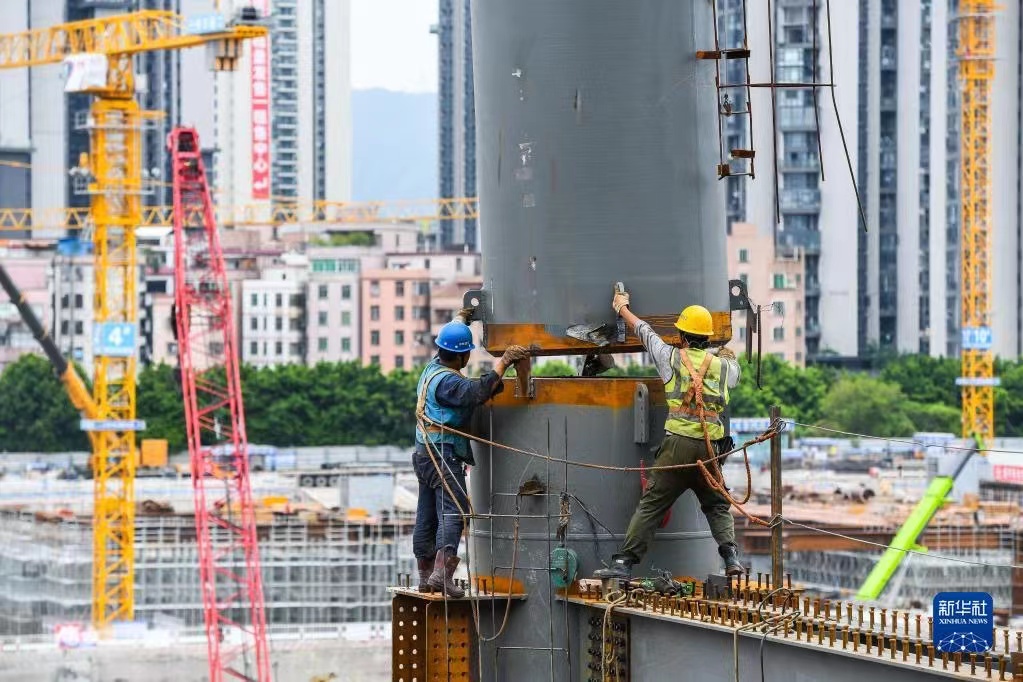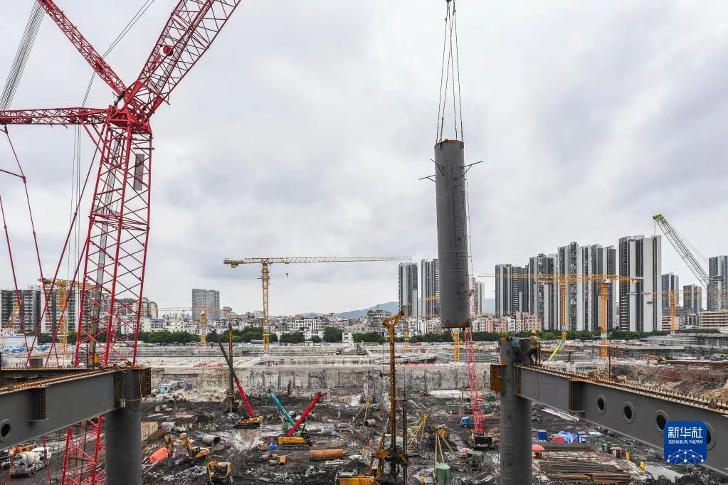 8月4日,建設者在廣州白云火車站二期工程施工現場吊裝鋼結構疊合柱。新華社記者 劉大偉 攝