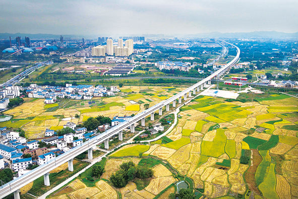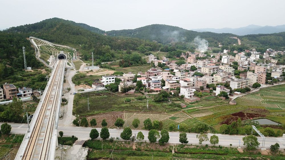2022年4月26日,港深高鐵經過廣東省河源市龍川縣佗城鎮佳派村。新華社記者 李思佳攝